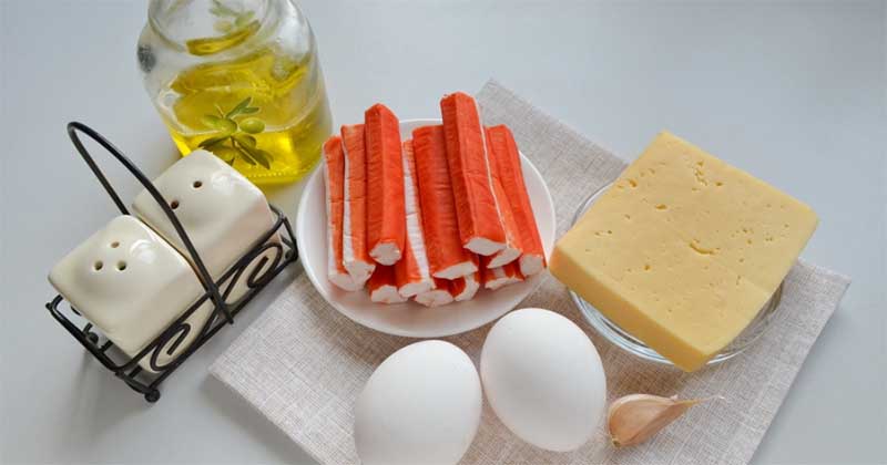 - Для котлет понадобятся всего четыре ингредиента: крабовые палочки, сыр, чеснок и яйца. Если яйца мелкие, то возьмите три штуки. Соль и перец используйте по желанию, на мой вкус соль не нужна совсем, а вот перца щепотку добавить можно. С крабовых палочек снимите обертки, очистите чеснок.