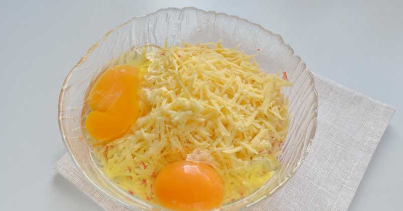 - Добавляем к палочкам тертый сыр, измельченный чеснок, сырые яйца. Перемешиваем. Фарш для котлет готов.