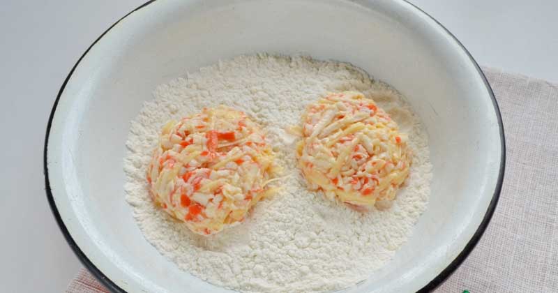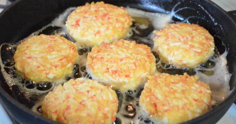 Эти котлеты по вкусу очень напоминают рыбные, и не удивительно, ведь в их состав входят крабовые палочки рыбный фарш. А в сочетании с чесноком и сыром получится весьма интересно. Чтобы крабовые палочки можно было легко натереть на терке, они должны быть не заморожены, но слегка охлаждены. Добавляем тертый сыр, яйца и чеснок. Формируем котлеты и обжариваем на сковороде на среднем огне.