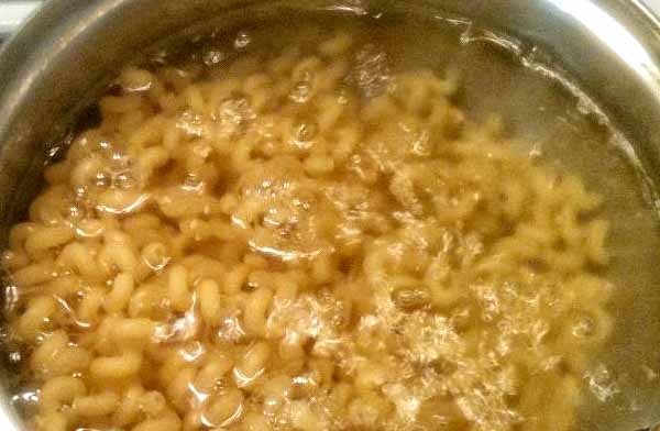 3. Всыпать макароны, перемешать, довести до кипения. Накрыть крышкой, уменьшить огонь. Макароны отварить в подсоленной воде (10 минут). (Время варки макарон зависит от сорта, поэтому рекомендовано варить макароны согласно инструкции на упаковке.)