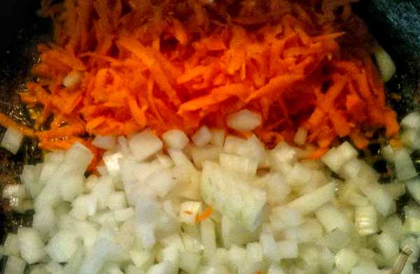 7. На сковороде разогреть масло, выложить овощи. Морковь и лук жарить на сковороде в растительном масле 5 минут на среднем огне, помешивая.