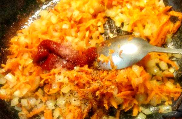 8. В овощную поджарку для макарон добавить кетчуп или томатную пасту, посолить, поперчить, перемешать.