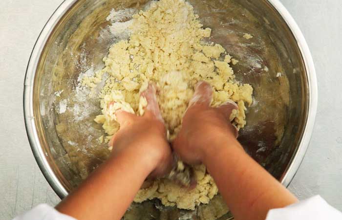 3. В отдельной емкости смешать руками муку с сахаром и сливочным маслом до комкообразного состояния, выскоблить в тесто содержимое ванильных стручков и добавить корицу.