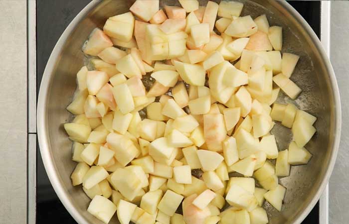 2. Растопить немного сливочного масла на сковороде и обжарить яблочные дольки до мягкости. После того как они размякнут, залить их кальвадосом, посыпать корицей и дать постоять на огне, пока алкоголь не выпарится.